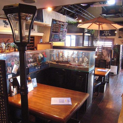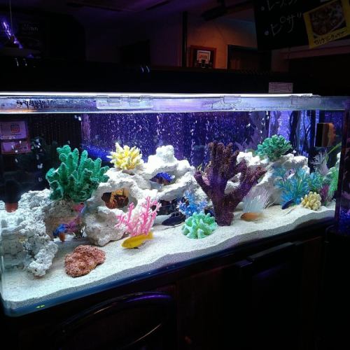 店内中央の大きな水槽は綺麗なビー玉が敷き詰められて、青い照明がキラキラ★☆日常を忘れて、心行くまでおくつろぎいただける癒しの空間です♪