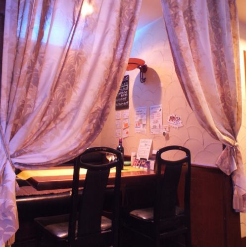 ソファー席はカーテンで仕切られていて、雰囲気も◎まるでリゾートにいるような感覚で、お酒や食事を楽しめちゃいます♪カーテンを閉めれば周りの目も気にならない個室空間になります☆デートや女子会に大人気の席です。人気の席なので早めに予約してね!!早い者勝ちです♪